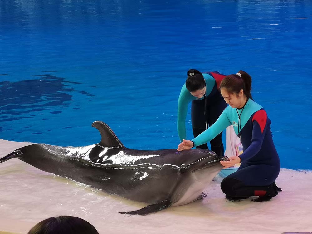 看著海豚在水中表演“水中芭蕾”,海豚與人類共同演譯的空中飛人,默契程度真是百分之一百的,體現(xiàn)人和動物的和諧共處。第一次覺得海豚是如此可愛的生物,真是萌化了一群大朋友的心。