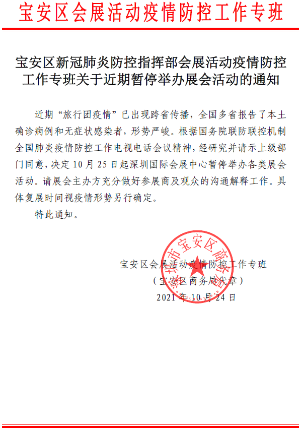 受近期疫情出現(xiàn)跨省傳播影響,深圳市寶安區(qū)會展活動疫情防控工作專班通知:“10月25日起深圳國際會展中心暫停舉辦各類展會活動。”樂視科技原定于2021年10月28日-30日在深圳國際會展中心舉辦的VisionChina2021(深圳)機器視覺展也將要延期舉辦,具體復展時間另行通知!