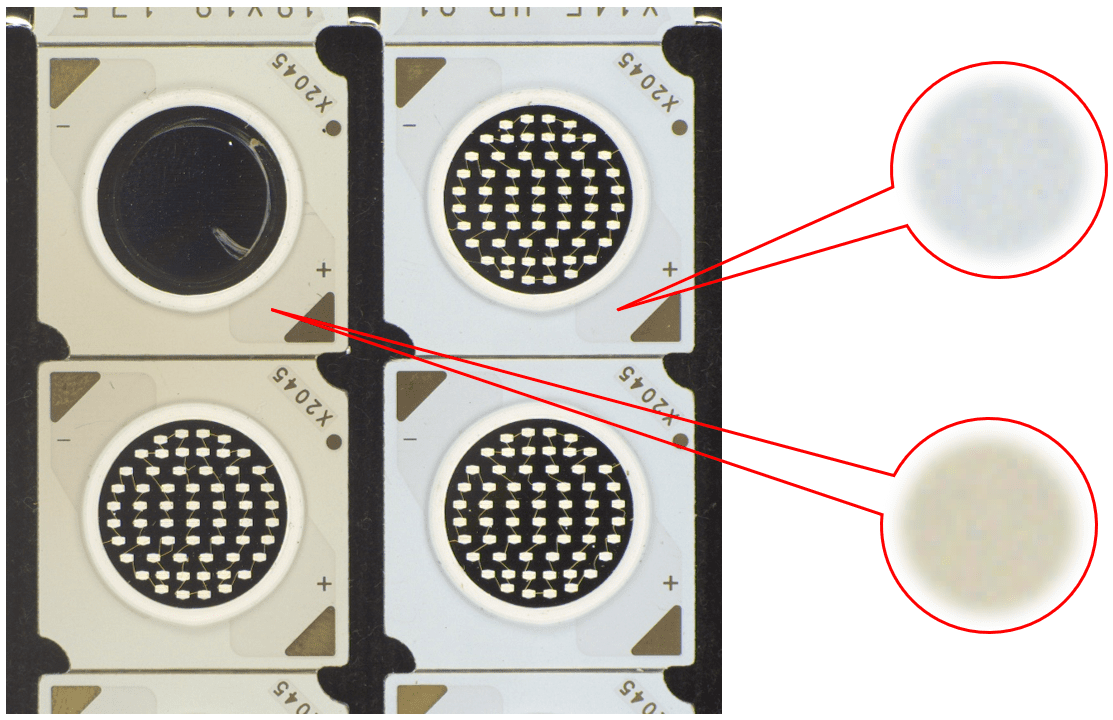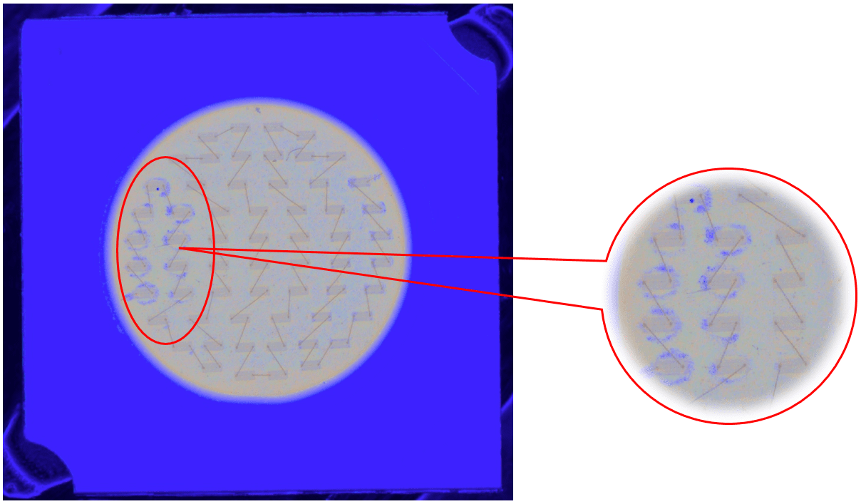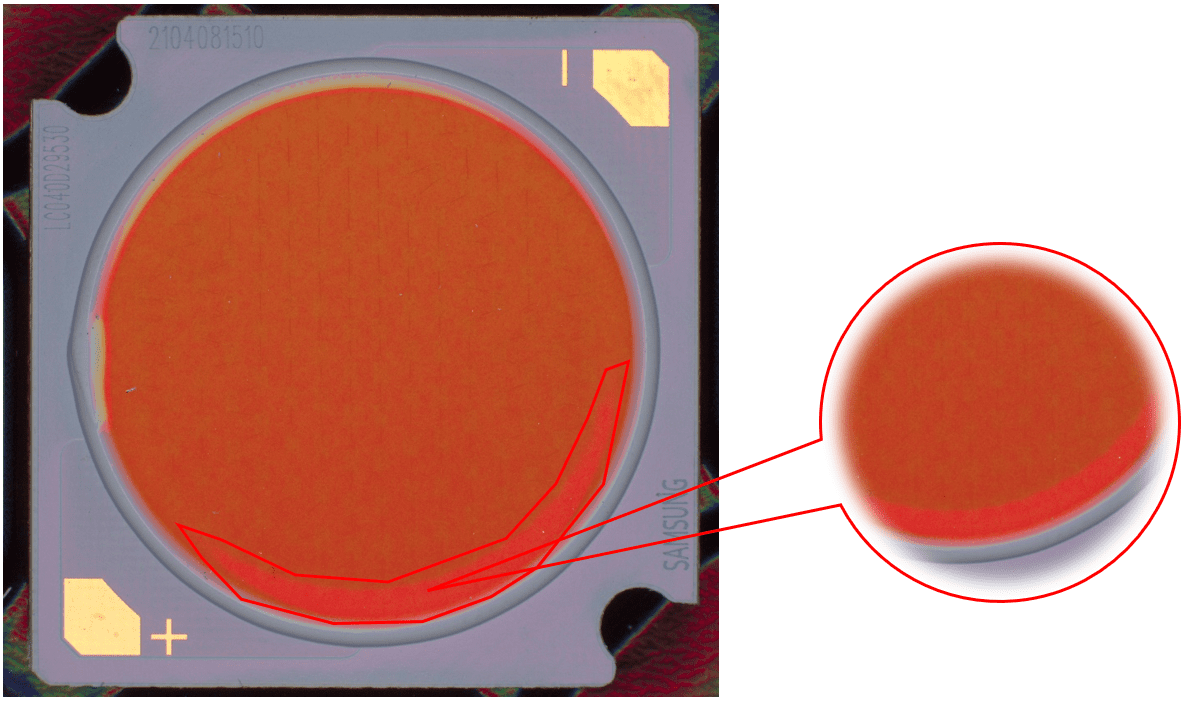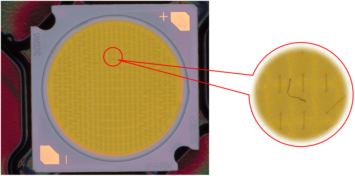 說(shuō)明:燈珠表面有膠通過(guò)高角度垂直照射,凸顯出劃傷。