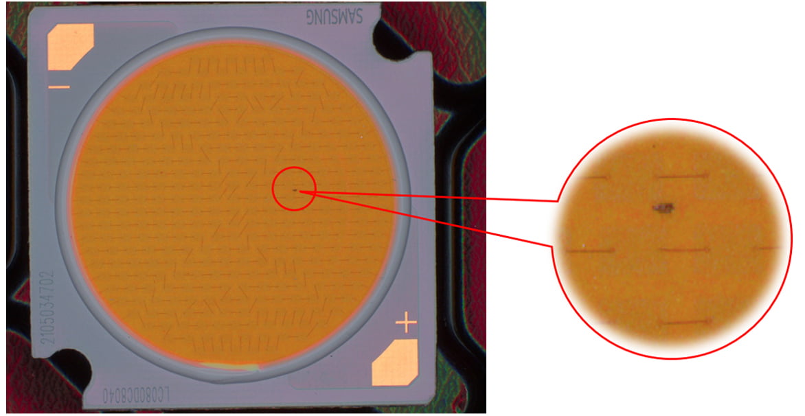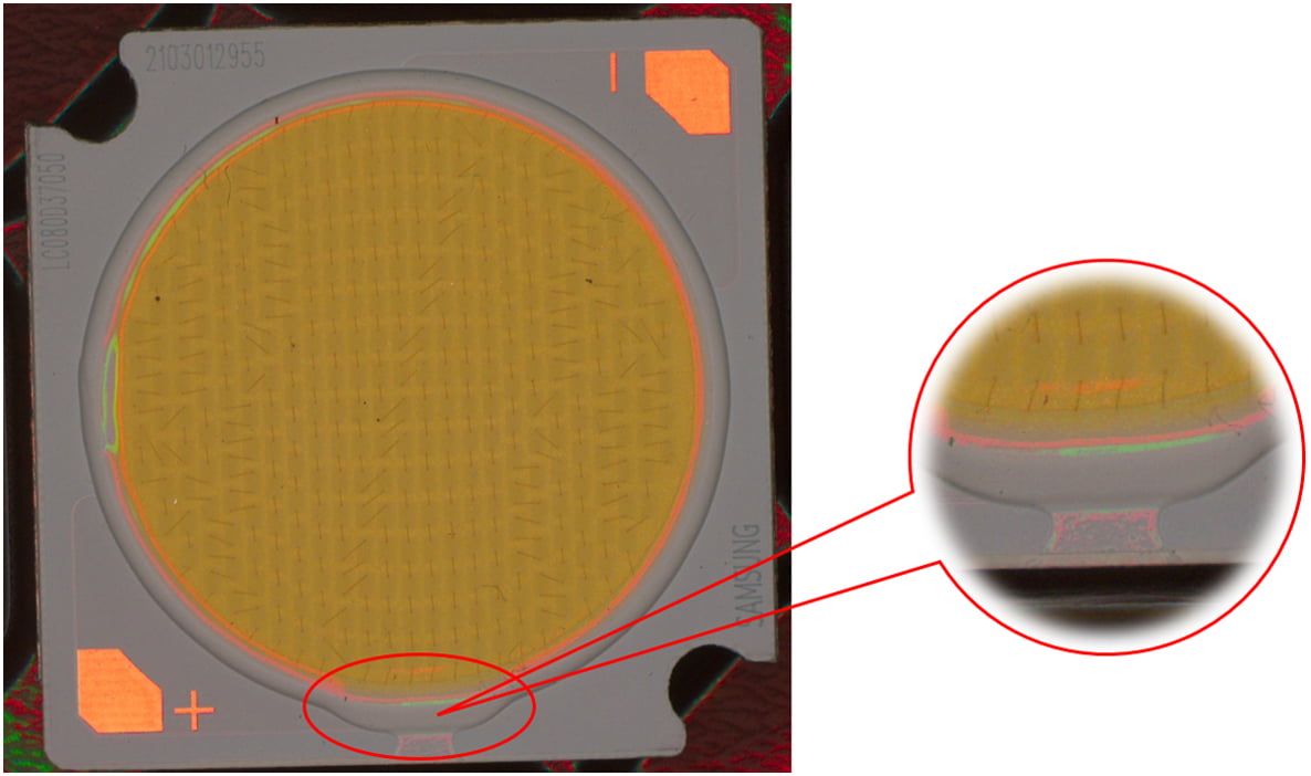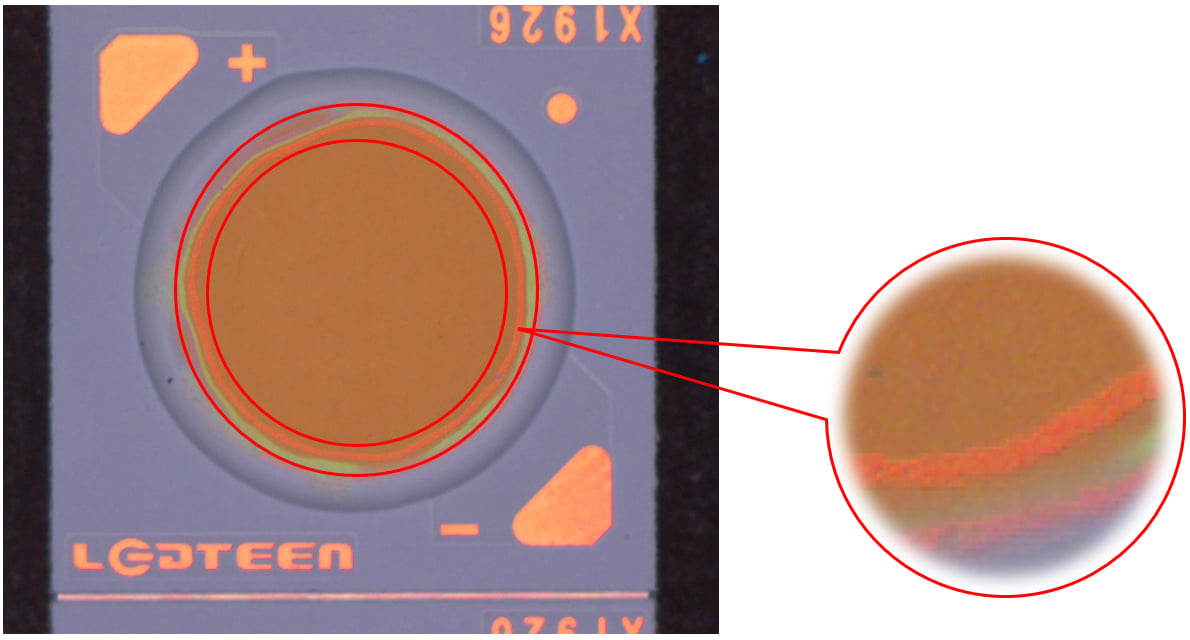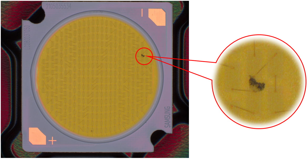 說(shuō)明:燈珠表面有膠通過(guò)高角度垂直照射,凸顯出劃傷。
