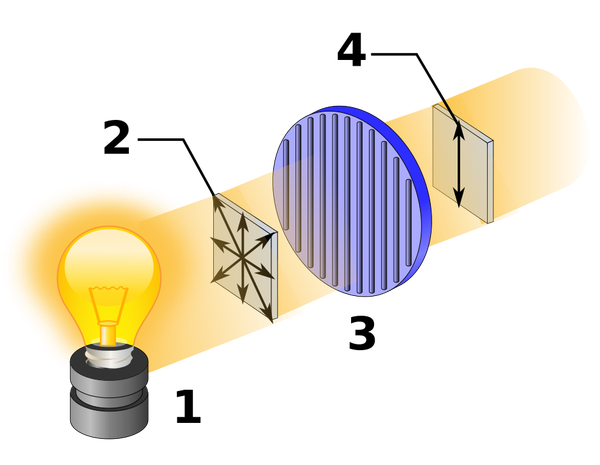 偏振鏡的作用就是就是消除或保留某個(gè)方向的偏振光。上圖說(shuō)明了偏振鏡的原理:1(白熾燈發(fā)出的)2(非偏振光)通過(guò)3(偏振鏡)的過(guò)濾變成了4(在一個(gè)方向上震蕩的偏振光)。