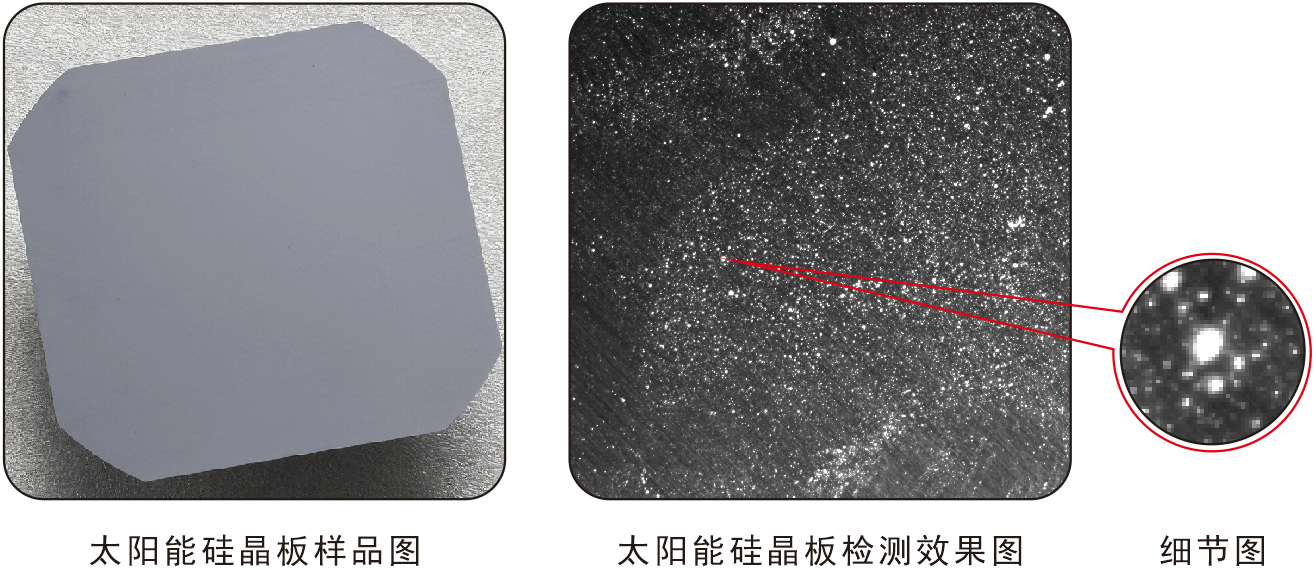 在太陽能硅晶板生產過程中,由于環境原因或操作不當等原因,會導致表面沾染灰塵,影響光伏發電效率,因此,需要對硅晶板進行灰塵檢測。由于灰塵點體積較小,光線平行度不夠時無法讓表面灰塵顯現出來。線形光纖光源有較好的平行性,用來照射硅晶板表面,能夠讓灰塵與背景呈現較高對比度,滿足檢測需求。