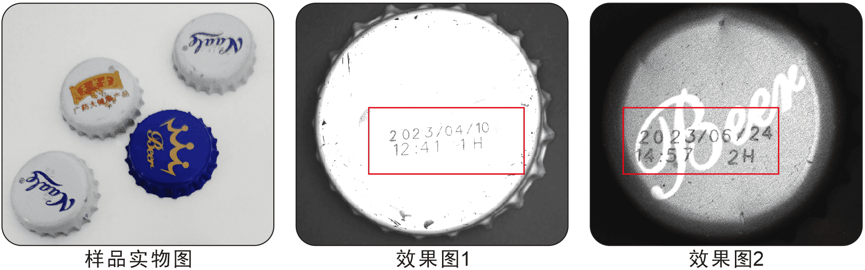 需要檢測不同顏色瓶蓋上的日期字符,難點在于顏色種類較多,背景干擾大。采用多種類型光源測試后,最后確定采用垂直光路的同軸光源。
