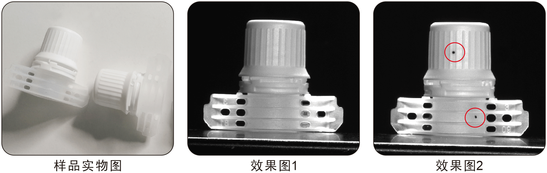 兒童飲料吸嘴蓋要求非常高,不僅是衛生方面,本身產品材質也是非常有講究,對于視覺檢測只需檢測其中臟污、瑕疵等特征。因為吸嘴需要360度一整圈全檢,所以這也增加了檢測難度,此項目采用采用雙相機在側面每次1/2拍攝面,條形光源在正上方稍做傾斜拍攝,這也既保持低角度類型表面檢測,也能盡可能的增大均勻的照射面積。