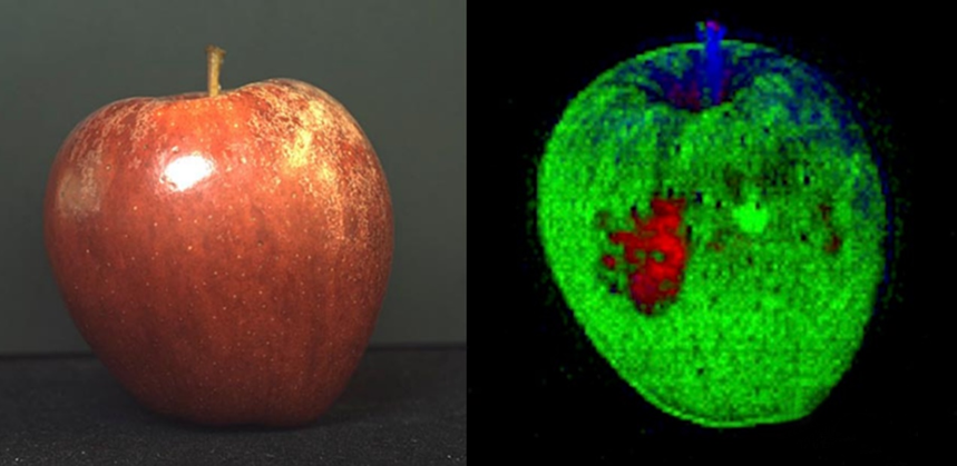 水在SWIR區域強烈吸收光,導致農業和農業中的大量水分分布檢測應用以及檢查瓶中水性液體的填充水平。硅對SWIR輻射的透明性使得能夠檢測非表面半導體和太陽能電池,包括檢測半導體晶錠中的雜質和多晶材料中的裂縫,而在回收過程中,可以區分塑料材料。有機材料和塑料根據其成分選擇性吸收SWIR波長而產生的獨特“指紋”可使高光譜成像成為它們的唯一識別。這將紅外光譜與機器視覺相結合,生成根據被成像物體的化學成分進行顏色編碼的圖像,如下圖所示。SWIR成像還可以測量250℃和800℃之間的溫度,使其可用于在制造和焊接應用的早期檢查熱玻璃材料。