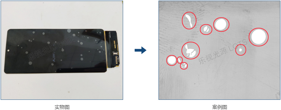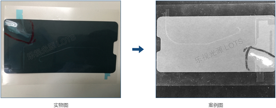 屏幕中層膜貼合會(huì)有氣泡,使用同軸線光,能更好的突顯出氣泡,藍(lán)色可以有效的提升效果的對(duì)比度,更利于圖像處理。