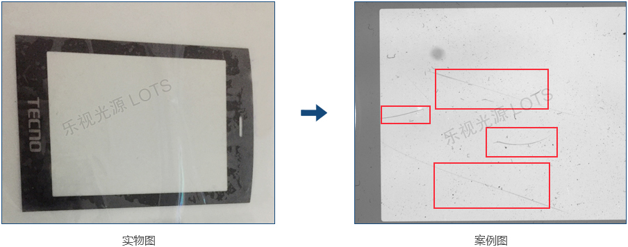 屏幕表面劃傷比較輕微,玻璃表面比較光滑,使用同軸光源能檢測出細(xì)微的劃傷,劃傷位置能有較高的對(duì)比度。