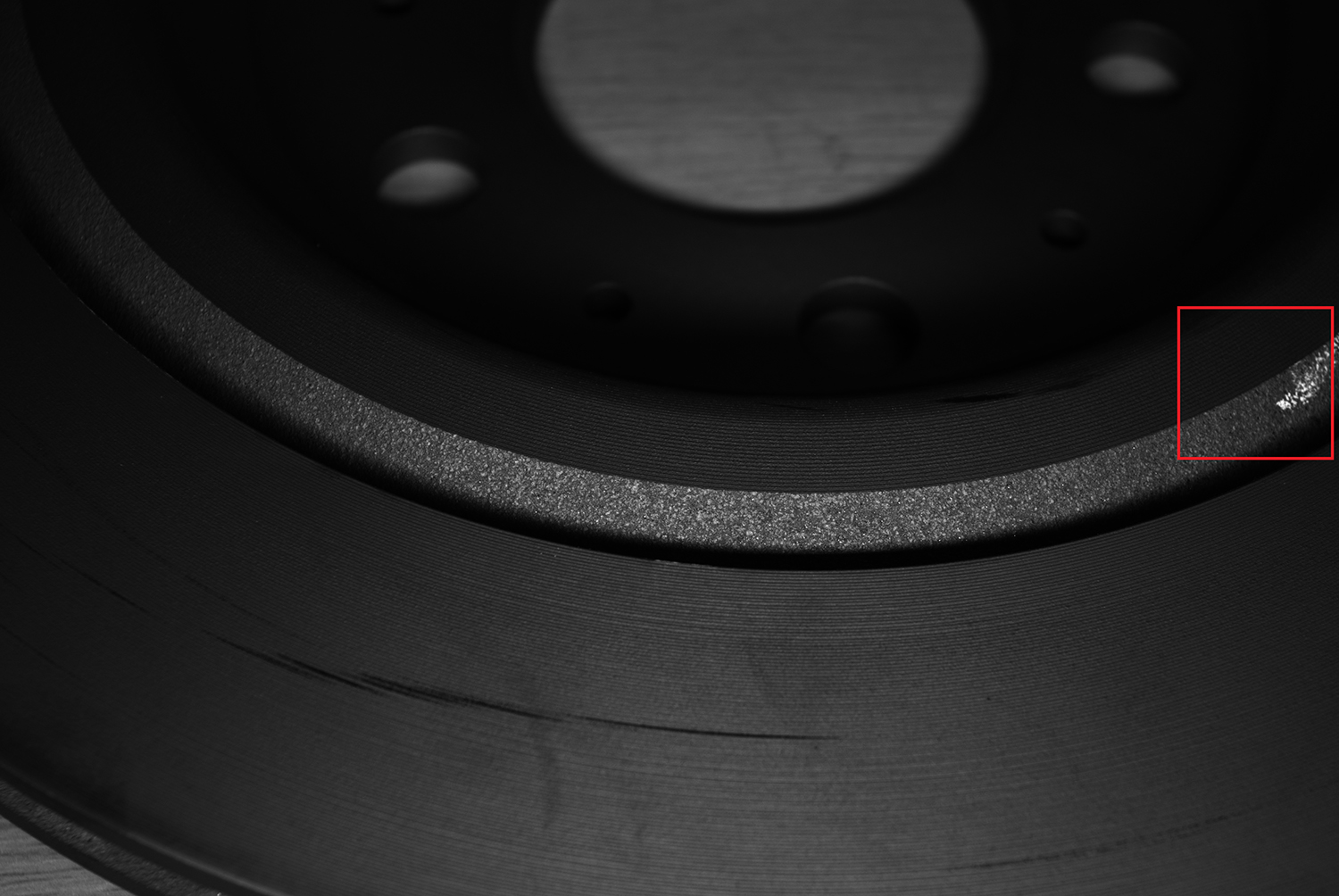 剎車盤正面尺寸大(直徑 30-40cm)且帶散熱筋(高低差 1-2cm),普通光源易產生陰影。采用“大景深短焦鏡頭結合開孔面光源”組合,鏡頭覆蓋高低差區域避免失焦,面光源均勻照射消除陰影。測試顯示,0.5mm 劃痕、0.3mm 砂眼呈明顯黑色,與淺灰色背景對比清晰,無漏判(如圖1所示)。