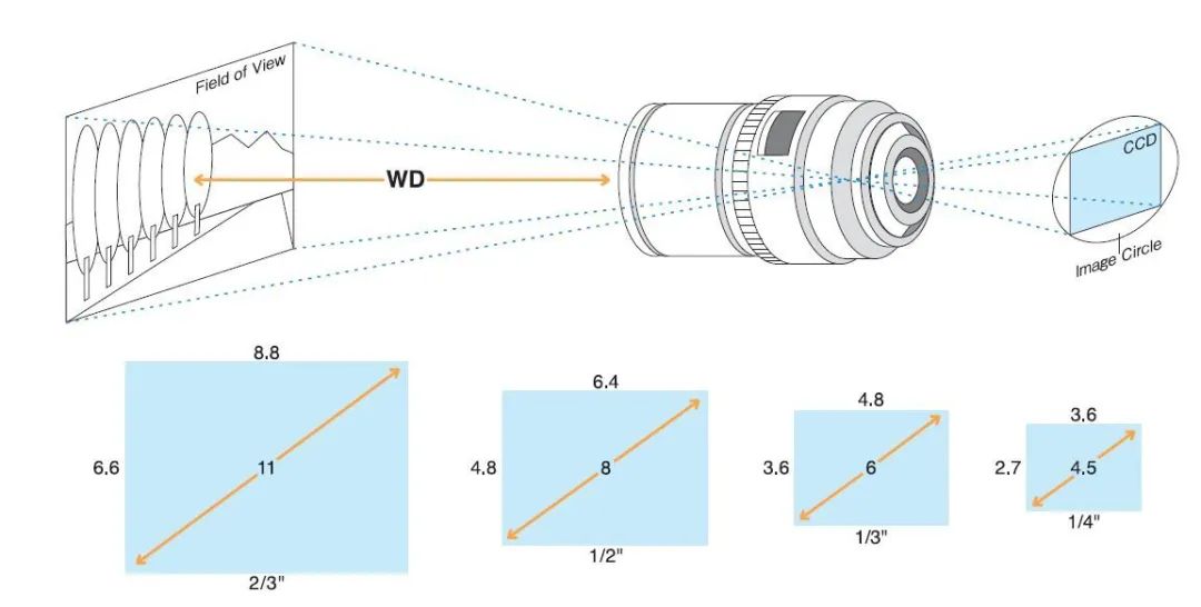 傳感器(CCD/CMOS)尺寸的表示方法大惑不解,因為像1/1.8英寸、2/3英寸之類的尺寸,既不是任何一條邊的尺寸,也不是其對角線尺寸,看著這樣的尺寸,往往難以形成具體尺寸大小的概念。