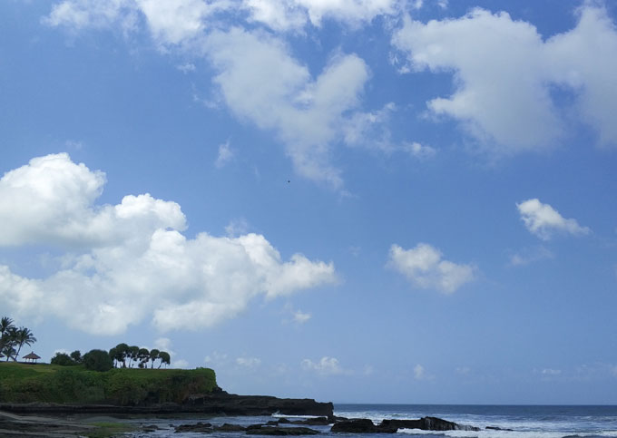 海神廟(Tanah Lot)旁邊連綿矗立著巨大而奇形的灰黑色巖壁,沿著巖壁一路往前走,可以看到蔚藍色的大海卷著海浪一次又一次沖擊著半圓形的沙灘,翻滾著重重地拍打在礁石上,發出陣陣巨響。