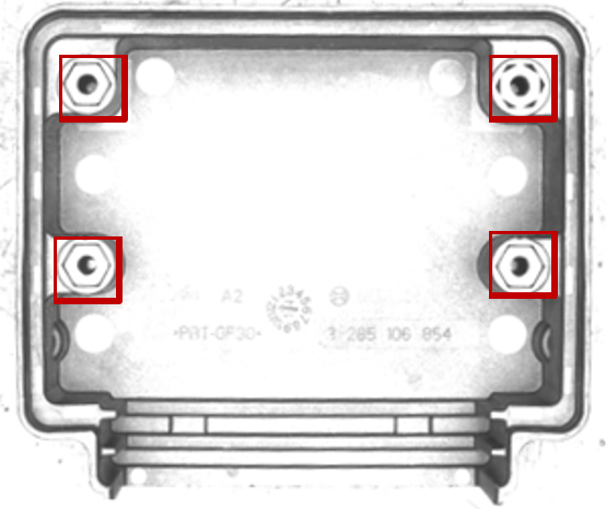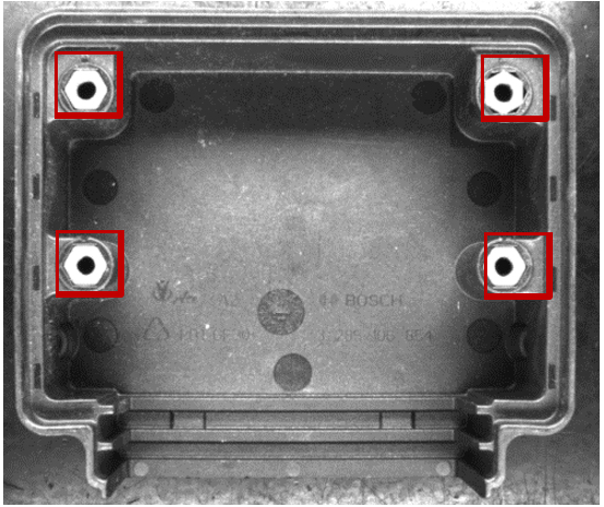 (二)組合條光源:可以識別四顆螺絲帽的有無,同時也能也能識別螺絲帽偏位的情況,效果還算比較理想,但是整體圖像均勻性還有所欠缺。