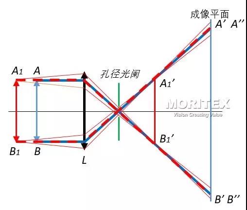 為了解決這個(gè)問(wèn)題,我們把孔徑光闌放置在透鏡像方的焦平面上,如圖2(b),此時(shí)由于孔徑光闌選擇成像光束的作用,只有物體發(fā)出的主光線平行于光軸的很細(xì)的一束光參與成像,所以,無(wú)論物體位于位置AB還是A1B1,他們的主光線是重合的,其在成像平面上的投影中心點(diǎn)是相同的,因此,雖然物體位于A1B1時(shí),其像仍然是A1’ B1’,但在成像平面上的彌散斑的中心間距A1’’ B1’’=A’B’,這樣就解決了上述因近大遠(yuǎn)小,導(dǎo)致測(cè)量不準(zhǔn)的問(wèn)題。這個(gè)光路的特點(diǎn)是入瞳位于無(wú)窮遠(yuǎn),物方參與成像光束的主光線平行于光軸,故稱此光路為“物方遠(yuǎn)心光路”,而用“物方遠(yuǎn)心光路”設(shè)計(jì)的鏡頭稱“物方遠(yuǎn)心鏡頭”。