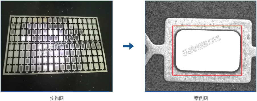 需檢測(cè)特征為邊緣定位,金屬片高反光材質(zhì),使用平行度更好的狹角同軸光打亮金屬片為白,邊緣為黑。