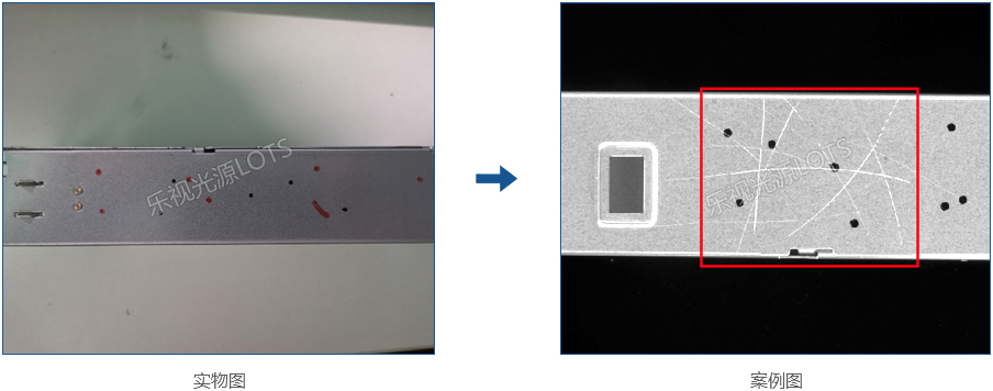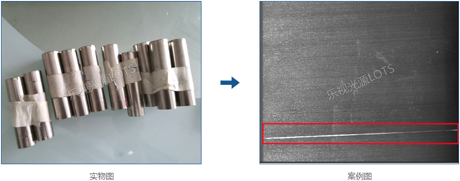 產(chǎn)品反光較高,用條形光兩側(cè)打,光打到金屬上反射到其它地方為黑,打出劃痕為白,對(duì)比明顯。