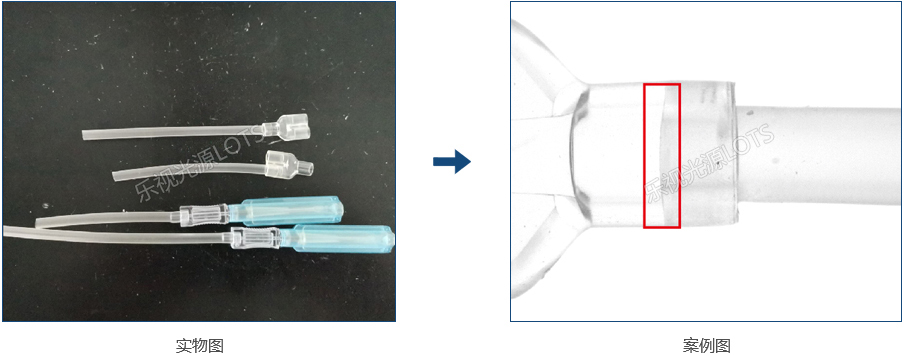 使用紅外背光源打穿產品,由于輸液軟管與需插入硬管材質不同,兩者呈現不同灰度,實現檢測目的。