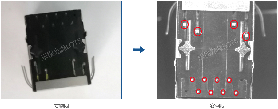 連接器針腳未露在塑膠表面,形狀大小不一,同軸光垂直照射,使塑膠內部 針腳均勻,穩定的呈現。