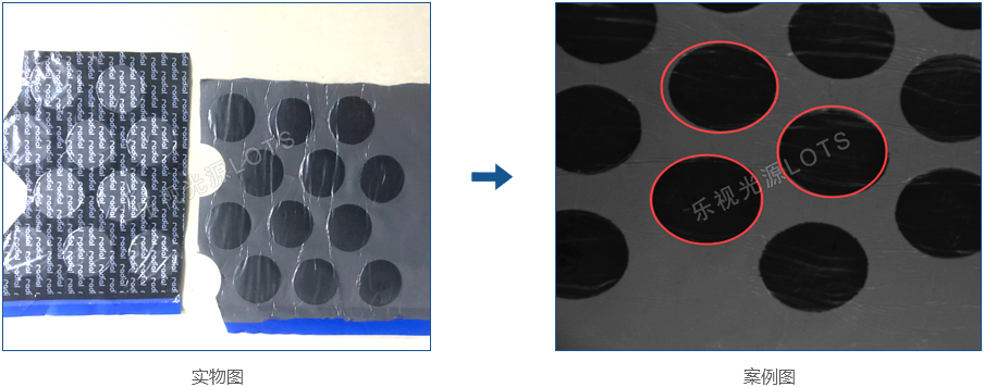 需要檢測出上面黑色園的輪廓,產(chǎn)品較大且表面有塑料薄膜,因此用條形光加偏振減少反光,效果明顯。