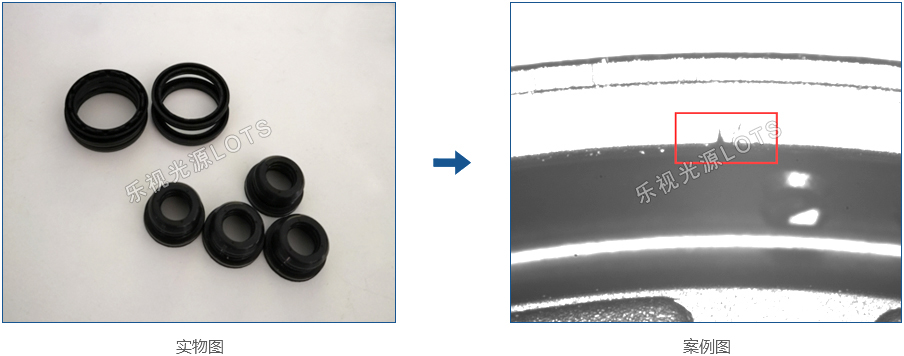 缺陷在吸光嚴(yán)重的黑色塑膠圈端面,需用高亮環(huán)形光源,端面打白,缺陷打黑,對比明顯。